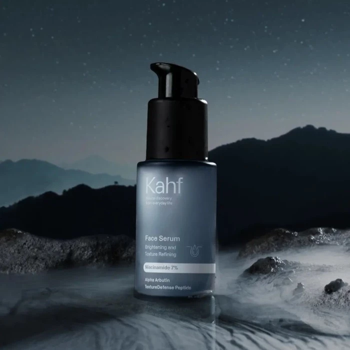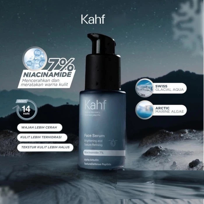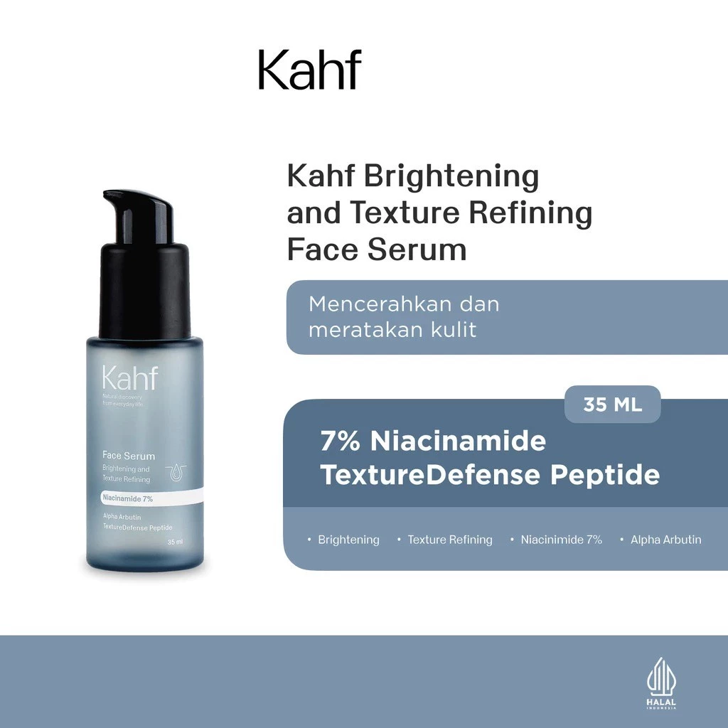 Kahf Brightening and Texture Refining Face Serum 35 ml merupakan Serum wajah khusus pria yang menyegarkan dan bekerja secara ganda untuk melawan tampilan wajah kusam serta menyamarkan tanda-tanda penuaan. Dengan Alpha Arbutin dan Niacinamide 7% membantu mencerahkan wajah, menyamarkan noda hitam, dan meratakan pigmen wajah. Diperkaya dengan kombinasi TextureDefense Peptide dan Arctic Algae yang menyamarkan garis halus dan kerutan serta menghaluskan kulit.